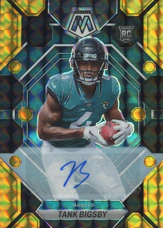 This card is 1 of 63 Tank Bigsby's card variations in the 2023 Mosaic set being tracked by Sports Card Investor, including Base, Choice Red & Green, Green, Mosaic, and No Huddle.