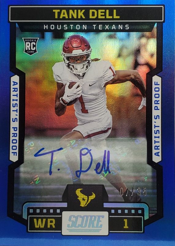 This card is 1 of 8 Tank Dell's card variations in the 2023 Score set being tracked by Sports Card Investor, including Rookie Signatures, Rookie Signatures - Green, Rookie Signatures - Gold Zone /50, Rookie Signatures - Red Zone /20, and Rookie Signatures - First Down /10.