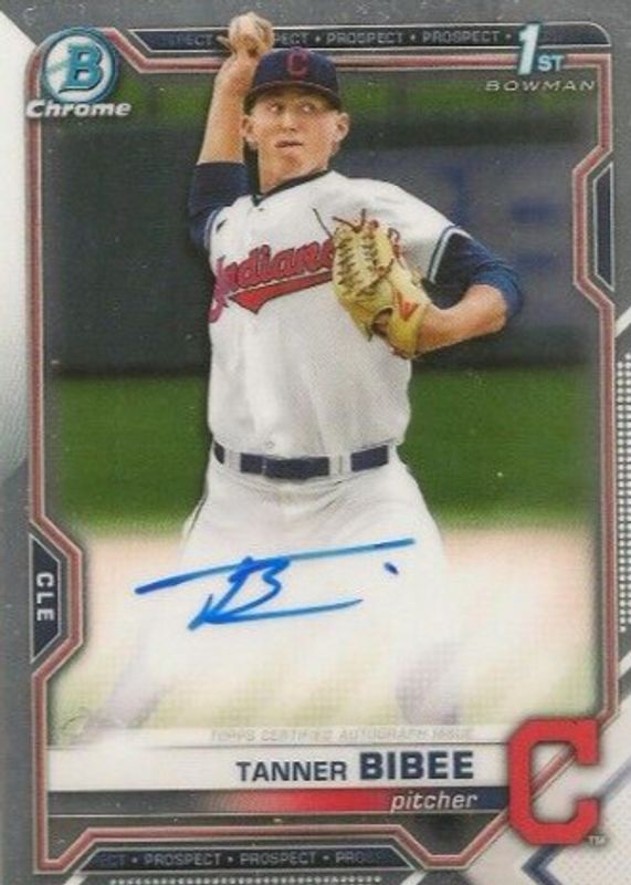 The Tanner Bibee 2021 Bowman Draft #CDA-TBI Chrome DP Auto (1st) card in Raw condition has moved up $12.99 (+186%) in the last 30 days and was last sold for $19.99 .