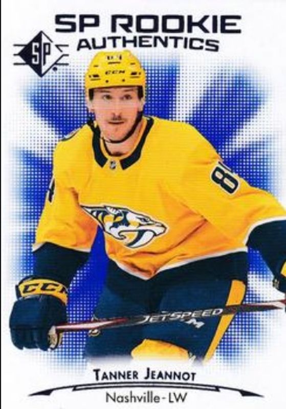 The Tanner Jeannot 2021 SP #103 Blue Rookie card is 1 of 13 Tanner Jeannot's card variations in the 2021 SP set being tracked by Sports Card Investor, including Foilboard, Gold Patterned Foilboard, Green Patterned Foilboard, Rookie Authentics Jersey, and Rookie Authentics Signatures.