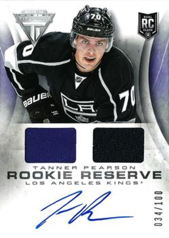 The Tanner Pearson 2013 Titanium #RR-TP Rookie Reserve Autographs Jersey /50 card is 1 of 17 Tanner Pearson's card variations in the 2013 Titanium set being tracked by Sports Card Investor, including Base /91, Commons Retail /299, Commons Retail Red /99, Hobby Draft Position /20, and Commons Retail Gold /10.