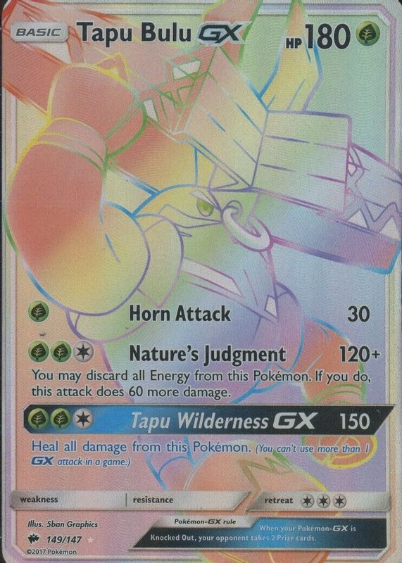 The Tapu Bulu GX 2017 Sun & Moon: Burning Shadows #149/147 Holo (Secret) card in Raw TCG (Near Mint) condition has moved up $3.22 (+36.4%) in the last 30 days and was last sold for $12.04 .