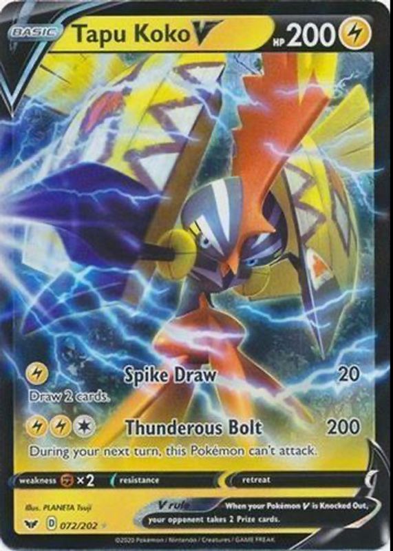 The Tapu Koko V 2020 Sword & Shield #072/202 Holo card in Raw TCG (Near Mint) condition has moved down -$0.08 (-4.5%) in the last 30 days and was last sold for $1.70 .