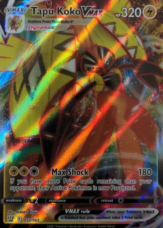 The Tapu Koko VMAX 2021 Sword & Shield: Battle Styles #051/163 Holo card in Raw TCG (Near Mint) condition has moved down -$0.46 (-15.4%) in the last 30 days and was last sold for $2.53 .