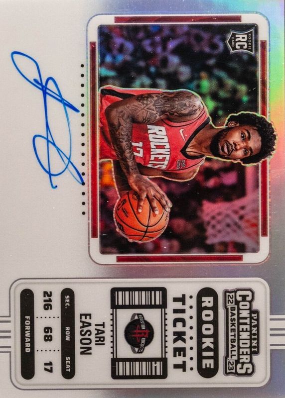 This card is 1 of 27 Tari Eason's card variations in the 2022 Contenders set being tracked by Sports Card Investor, including Rookie Ticket Auto, Rookie Ticket Auto - Premium, Rookie Ticket Auto - Premium Green Shimmer, Rookie Ticket Auto - Ticket Stub (/17), and Rookie Ticket Auto Variation.