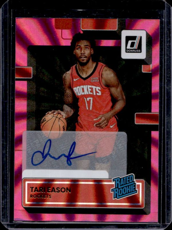 The Tari Eason 2022 Donruss #217 Rated Rookie Signatures - Holo Pink Laser card is 1 of 44 Tari Eason's card variations in the 2022 Donruss set being tracked by Sports Card Investor, including Base, Choice, Holo Green Laser, Holo Red & Gold Laser, and Press Proof Silver.