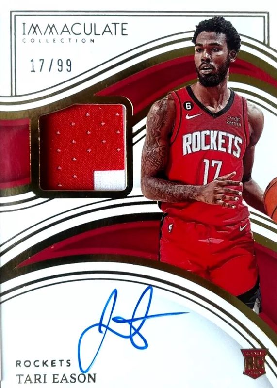 This card is 1 of 20 Tari Eason's card variations in the 2022 Immaculate set being tracked by Sports Card Investor, including Base /99, Red /49, Gold /10, Immaculate Rookie Introductions /99, and Remarkable Rookie Jerseys /99.
