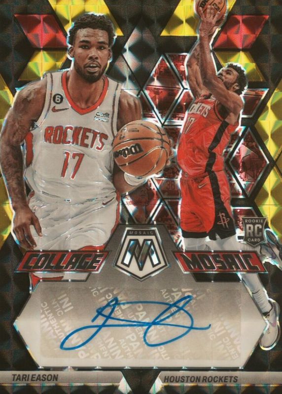 This card is 1 of 19 Tari Eason's card variations in the 2022 Mosaic set being tracked by Sports Card Investor, including Collage Autographs, Collage Autographs - Blue (/49), Collage Autographs - Choice, Collage Autographs - Red Wave, and Fast Break Autographs.