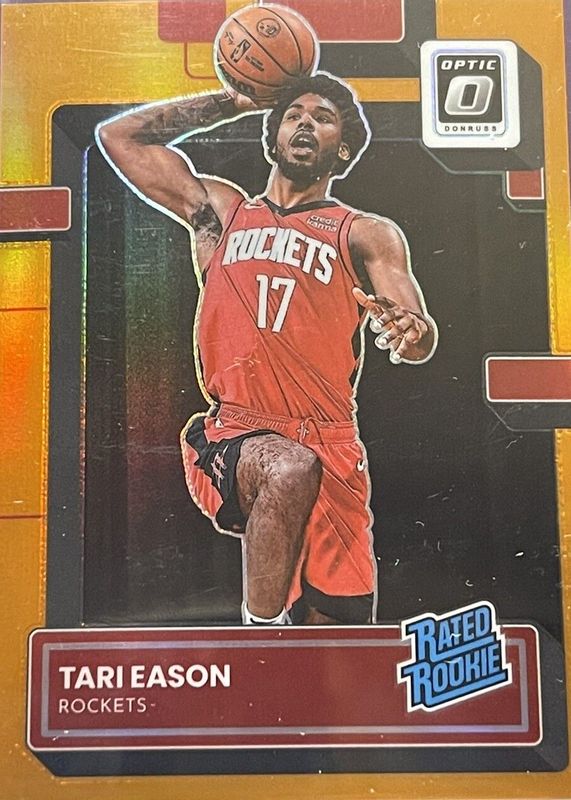 The Tari Eason 2022 Optic #203 Orange /199 Rookie card in Raw condition has not changed in price in the last 30 days and was last sold for $3.50 .