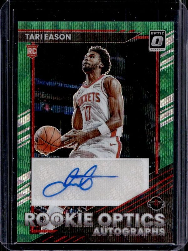 The Tari Eason 2022 Optic #ROA-TES Rookie Optics Autographs - Green Wave card is 1 of 84 Tari Eason's card variations in the 2022 Optic set being tracked by Sports Card Investor, including Base, Checkerboard, Choice, Choice Red & Green, and Fast Break.