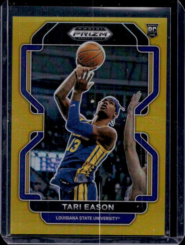The Tari Eason 2022 Prizm Draft Picks #65 Gold /10 Rookie card is 1 of 98 Tari Eason's card variations in the 2022 Prizm Draft Picks set being tracked by Sports Card Investor, including #65b Base, #65 Base, #65 Blue Circles, #65b Choice Blue Yellow & Green, and #65 Choice Blue Yellow & Green.