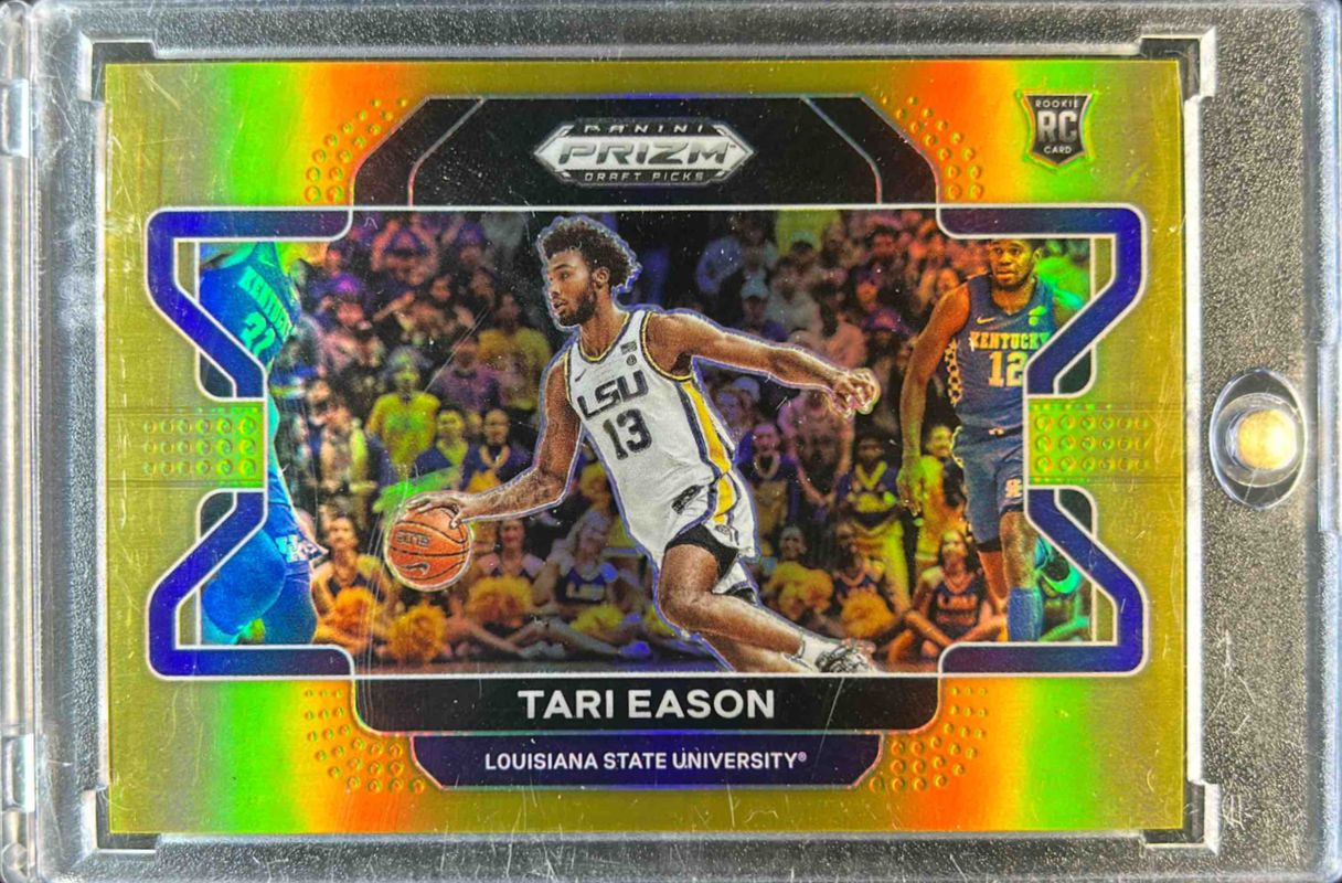 The Tari Eason 2022 Prizm Draft Picks #65b Gold /10 Rookie card is 1 of 98 Tari Eason's card variations in the 2022 Prizm Draft Picks set being tracked by Sports Card Investor, including #65b Base, #65 Base, #65 Blue Circles, #65b Choice Blue Yellow & Green, and #65 Choice Blue Yellow & Green.