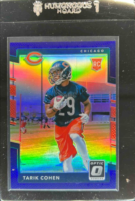The Tarik Cohen 2017 Optic #134 Purple /50 Rookie card is 1 of 26 Tarik Cohen's card variations in the 2017 Optic set being tracked by Sports Card Investor, including Base, Bronze, Holo, Lime, and Pink.