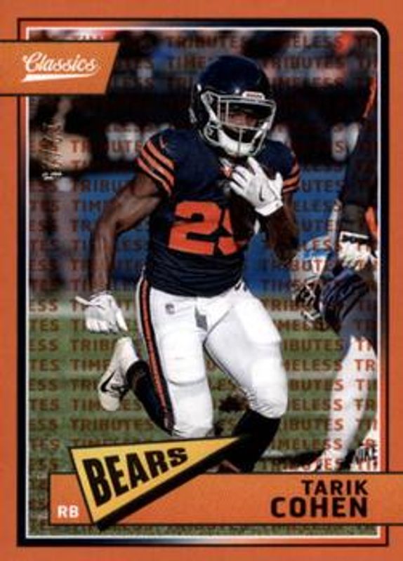 The Tarik Cohen 2018 Classics #19 Timeless Tributes - Orange /25 card is 1 of 16 Tarik Cohen's card variations in the 2018 Classics set being tracked by Sports Card Investor, including Base, Red Back /299, Blue Back (1st Edition) /175, Timeless Tributes - Gold /99, and Blank Back /50.