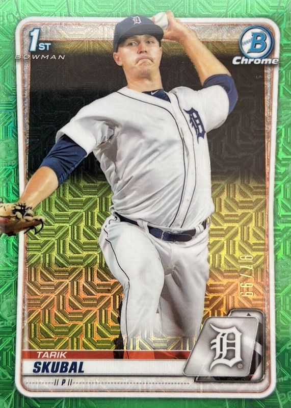 The Tarik Skubal 2020 Bowman Mega Box #BCP-108 Chrome Prospects - Green Mojo Refractor /99 (1st) card in Raw condition has not changed in price in the last 30 days and was last sold for $85.52 .