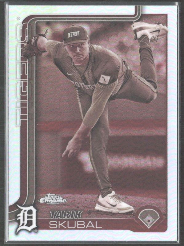 The Tarik Skubal 2025 Topps Chrome #258 Negative Refractor card is 1 of 84 Tarik Skubal's card variations in the 2025 Topps Chrome set being tracked by Sports Card Investor, including Base, Geometric Refractor, Image Variation, Lightboard Logo Variation, and Prism Refractor.