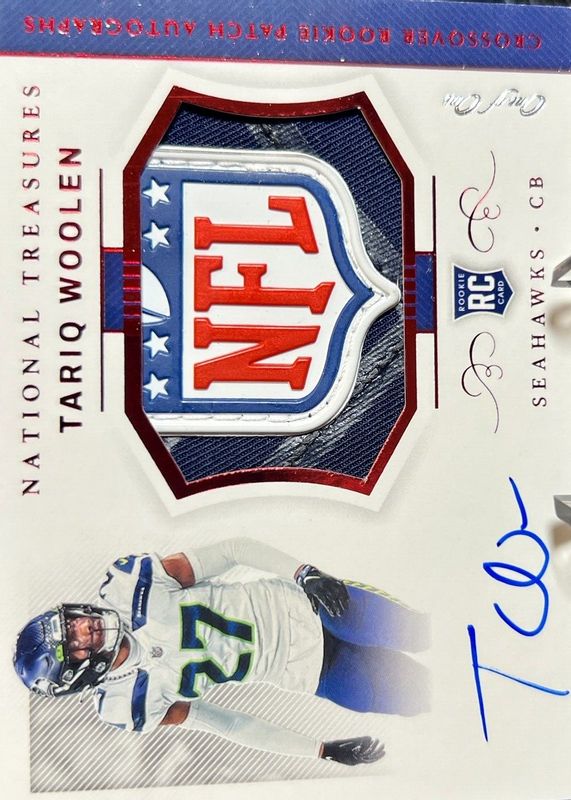 The Tariq Woolen 2022 National Treasures #CRPA-TW Crossover Rookie Patch Autographs - NFL Shield /1 card in Raw condition has not changed in price in the last 30 days and was last sold for $1,200.00 .