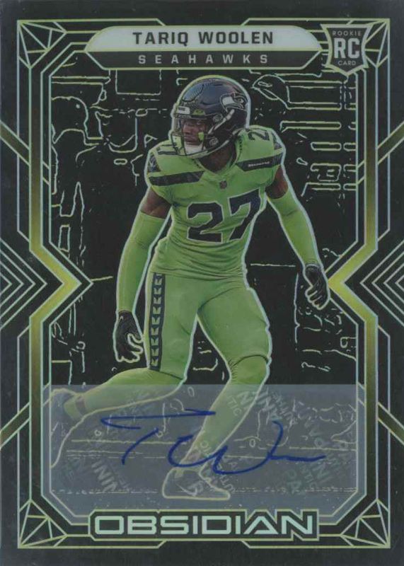 This card is 1 of 7 Tariq Woolen's card variations in the 2022 Obsidian set being tracked by Sports Card Investor, including Rookie Autographs (/199), Rookie Autographs - Electric Etch Orange /75, Rookie Autographs - Electric Etch Green /50, Rookie Autographs - Electric Etch Red /10, and Rookie Autographs - Electric Etch Red Flood /6.