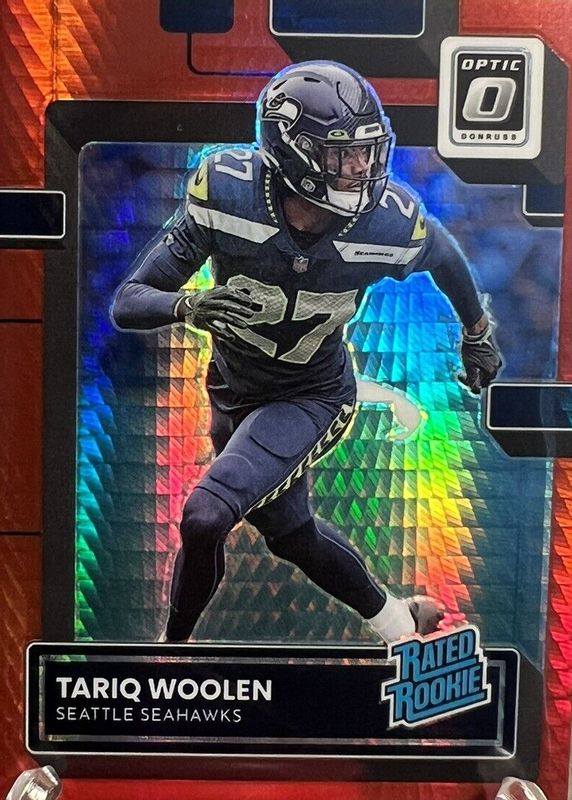 The Tariq Woolen 2022 Optic #298 Red Hyper Rookie card in Raw condition has not changed in price in the last 30 days and was last sold for $2.00 .