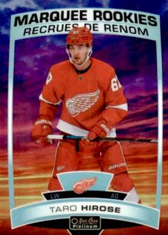 The Taro Hirose 2019 O-Pee-Chee Platinum #198 Sunset Rookie card is 1 of 32 Taro Hirose's card variations in the 2019 O-Pee-Chee Platinum set being tracked by Sports Card Investor, including Base, Matte Pink, Rainbow, Violet Pixels /399, and Red Prism /199.