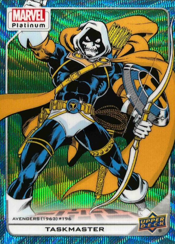 The Taskmaster 2023 Upper Deck Marvel Platinum #125 Blue Surge card is 1 of 30 Taskmaster's card variations in the 2023 Upper Deck Marvel Platinum set being tracked by Sports Card Investor, including Base, Black Rainbow, Blue Rainbow, Purple Rainbow, and Rainbow.