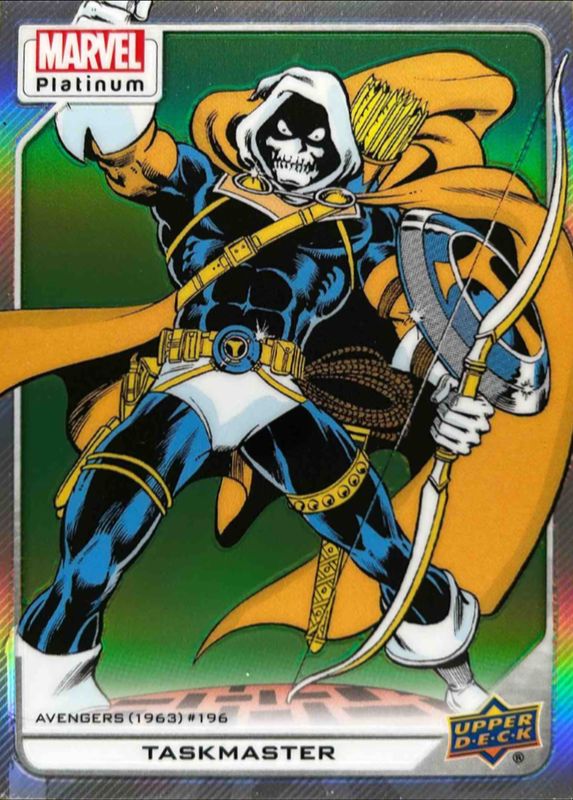 The Taskmaster 2023 Upper Deck Marvel Platinum #125 Rainbow card is 1 of 30 Taskmaster's card variations in the 2023 Upper Deck Marvel Platinum set being tracked by Sports Card Investor, including Base, Black Rainbow, Blue Rainbow, Blue Surge, and Purple Rainbow.