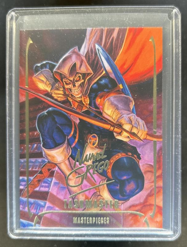 The Taskmaster 2024 Upper Deck Marvel Masterpieces Nahuel Grego #51 Gold Signatures Series card is 1 of 26 Taskmaster's card variations in the 2024 Upper Deck Marvel Masterpieces Nahuel Grego set being tracked by Sports Card Investor, including Base /1999, Gold Foil, Preliminary Art, Variant Cover /1499, and Epic Purple Foil /199.