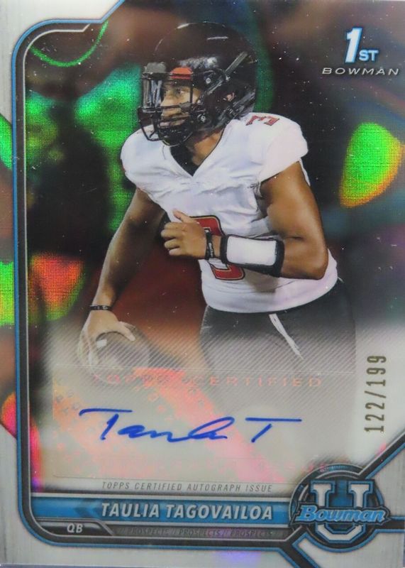 The Taulia Tagovailoa 2021 Bowman University #BCPA-TT Chrome Prospect Auto - Lava Refractor /199 (1st) card in Raw condition has not changed in price in the last 30 days and was last sold for $6.29 .