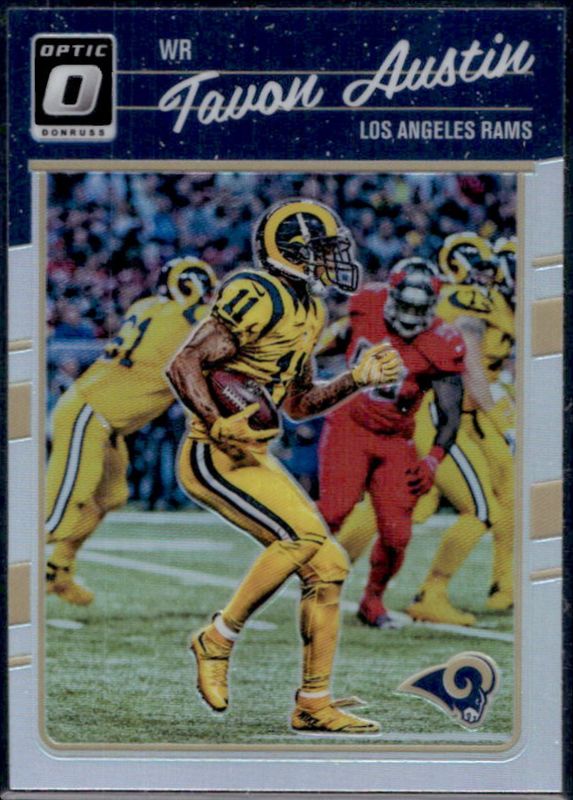 The Tavon Austin 2016 Optic #54 Holo card is 1 of 11 Tavon Austin's card variations in the 2016 Optic set being tracked by Sports Card Investor, including Base, Aqua /299, Orange /199, Blue /149, and Red /99.