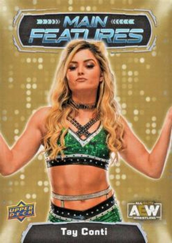The Tay Conti 2022 Upper Deck AEW #MF-16 Main Features Gold card is 1 of 35 Tay Conti's card variations in the 2022 Upper Deck AEW set being tracked by Sports Card Investor, including Base, Gold, Pyro, Silver Foil, and Green Pyro /399.