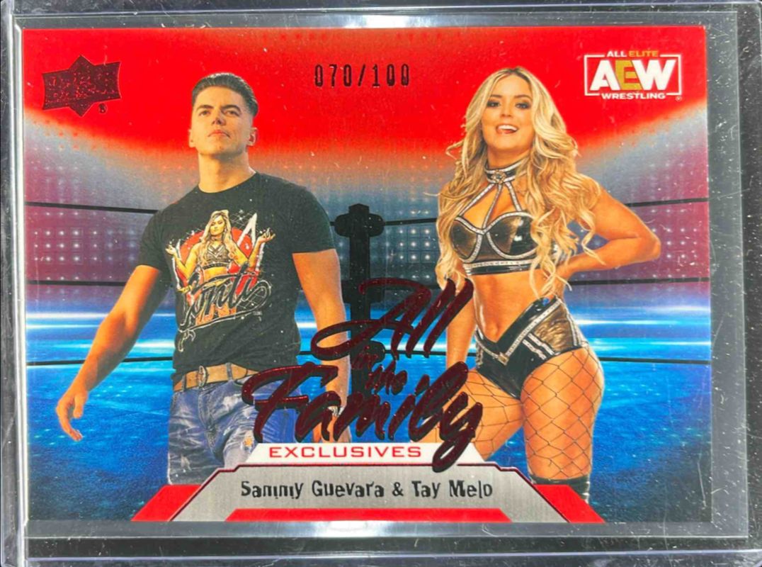 The Tay Melo 2023 Upper Deck AEW #98 Exclusives /100 card is 1 of 51 Tay Melo's card variations in the 2023 Upper Deck AEW set being tracked by Sports Card Investor, including #98 Base, #57 Base, #57 Clear Cut, #98 Clear Cut, and #57 Diamond Plate.