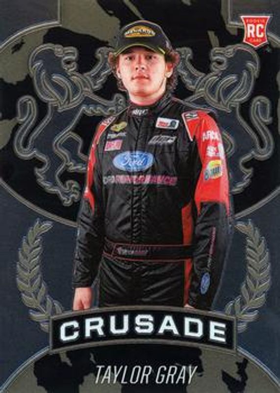 The Taylor Gray 2021 Chronicles NASCAR #5 Crusade Rookie card is 1 of 41 Taylor Gray's card variations in the 2021 Chronicles NASCAR set being tracked by Sports Card Investor, including Absolute, Absolute Autographs, Crusade Autographs, Crusade - Green, and Crusade - Holo.