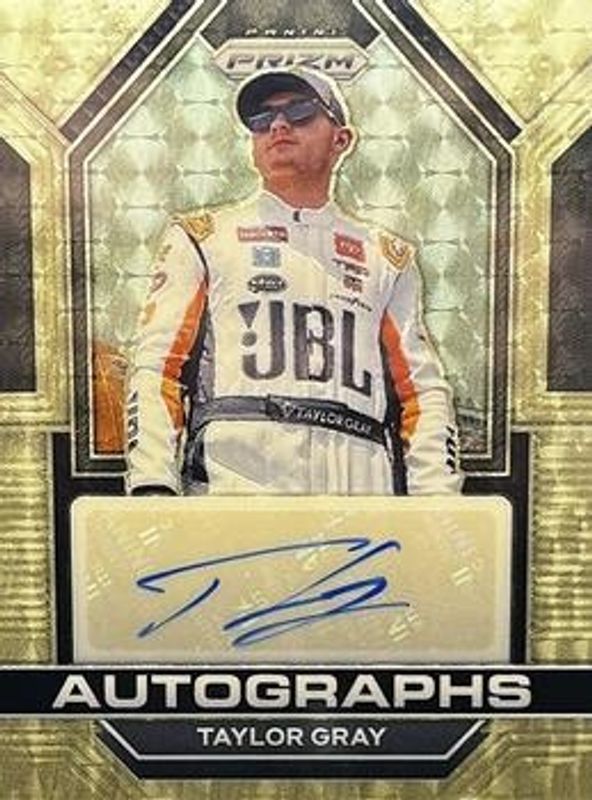The Taylor Gray 2023 Prizm NASCAR #A-TGY Autographs - Gold Vinyl /1 card is 1 of 7 Taylor Gray's card variations in the 2023 Prizm NASCAR set being tracked by Sports Card Investor, including Autographs, Autographs - Checkered Flag /50, Autographs - Rainbow /24, Autographs - Gold /10, and Autographs - White /5.