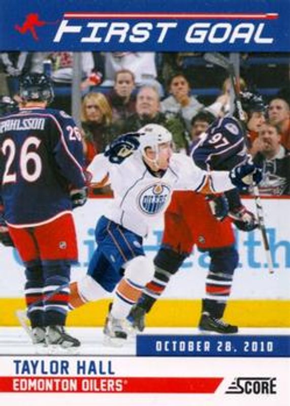 The Taylor Hall 2011 Score #2 First Goal card is 1 of 12 Taylor Hall's card variations in the 2011 Score set being tracked by Sports Card Investor, including #1 Base, #188 Base, #188 Black Ice, #1 Black Ice, and #188 Glossy.
