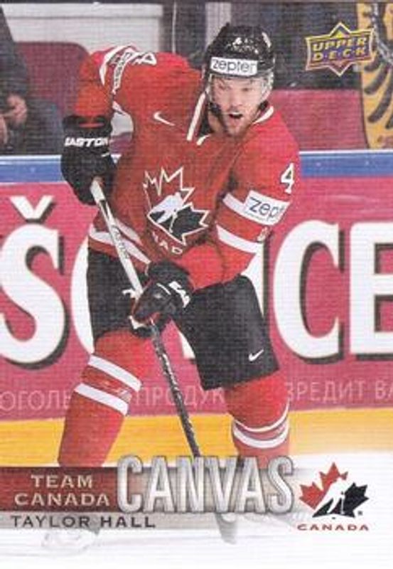 The Taylor Hall 2017 Upper Deck Team Canada #TCC-4 Team Canada Canvas card is 1 of 11 Taylor Hall's card variations in the 2017 Upper Deck Team Canada set being tracked by Sports Card Investor, including Base, Gold Foil Signatures, UD Exclusives Silver /100, UD Exclusives Gold /10, and Black Foil Signatures /5.