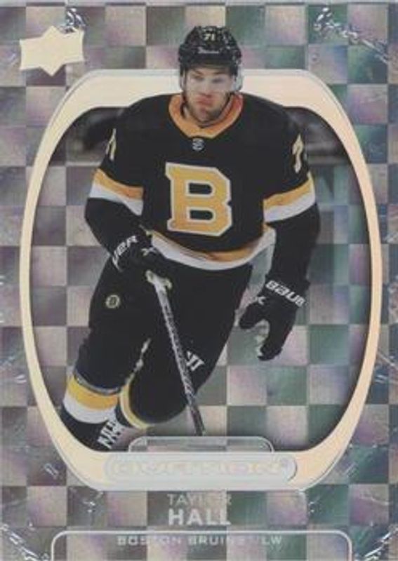 The Taylor Hall 2021 Upper Deck Ovation #73 Checkerboard card is 1 of 16 Taylor Hall's card variations in the 2021 Upper Deck Ovation set being tracked by Sports Card Investor, including Base, Gold Circular Wonder, Gold Foil, Silver Foil, and Standing Ovation /500.