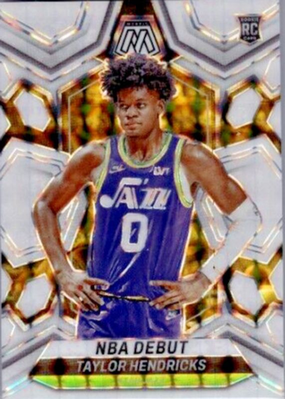 The Taylor Hendricks 2023 Mosaic #261 NBA Debut - White /25 Rookie card in Raw condition has not changed in price in the last 30 days and was last sold for $12.50 .