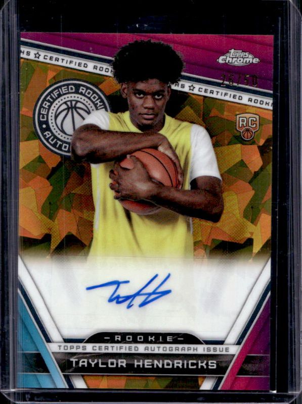 The Taylor Hendricks 2023 Topps Chrome Sapphire Edition #CRA-TH Certified Rookie Autographs - Gold /50 card is 1 of 23 Taylor Hendricks' card variations in the 2023 Topps Chrome Sapphire Edition set being tracked by Sports Card Investor, including Base, Gold /50, Orange /25, Purple /10, and Red /5.