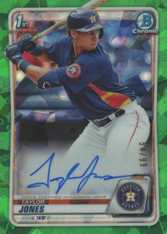 This card is 1 of 18 Taylor Jones' card variations in the 2020 Bowman Chrome set being tracked by Sports Card Investor, including Prospect Auto (1st), Prospect Auto - Refractor /499 (1st), Prospect Auto - Purple Refractor /250 (1st), Prospect Auto - Blue Refractor /150 (1st), and Prospect Auto - Choice Refractor /150 (1st).