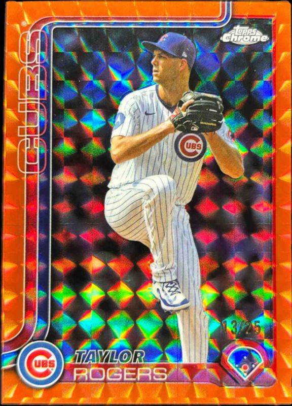 The Taylor Rogers 2025 Topps Chrome Update #USC147 Orange Geometric Refractor /25 card is 1 of 52 Taylor Rogers' card variations in the 2025 Topps Chrome Update set being tracked by Sports Card Investor, including Base, Geometric Refractor, Negative Refractor, Prism Refractor, and RayWave Refractor.