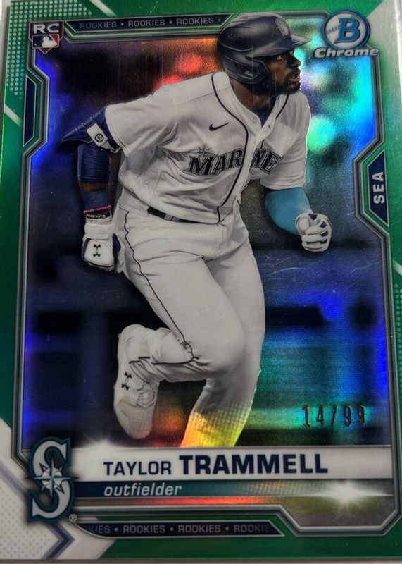 The Taylor Trammell 2021 Bowman Chrome #61 Green Refractor /99 Rookie card in Raw condition has not changed in price in the last 30 days and was last sold for $1.32 .