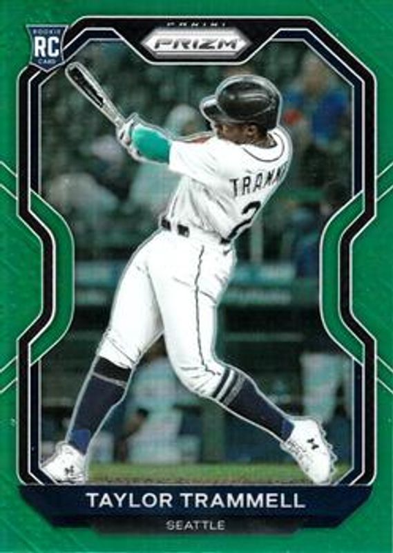 The Taylor Trammell 2021 Prizm #29 Green Rookie card is 1 of 43 Taylor Trammell's card variations in the 2021 Prizm set being tracked by Sports Card Investor, including Base, Blue, Blue Velocity, Carolina Blue, and Cosmic Haze.