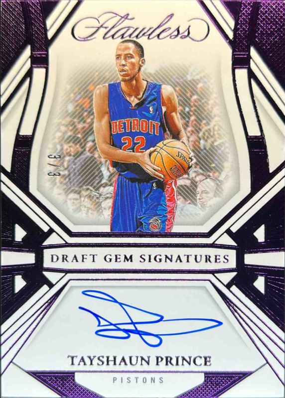The Tayshaun Prince 2023 Flawless #DGS-TYP Draft Gem Signatures - Amethyst /3 card is 1 of 21 Tayshaun Prince's card variations in the 2023 Flawless set being tracked by Sports Card Investor, including Draft Gem Signatures /25, Flawless Penmanship /25, Legendary Scripts /25, Draft Gem Signatures - Ruby /15, and Flawless Penmanship - Ruby /15.