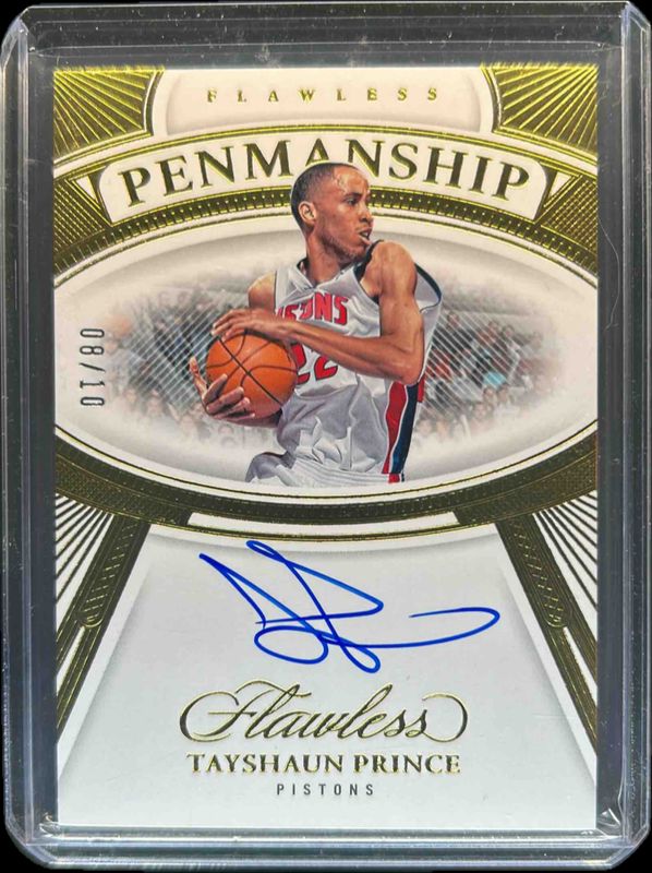 The Tayshaun Prince 2023 Flawless #FPS-TPC Flawless Penmanship - Gold /10 card is 1 of 21 Tayshaun Prince's card variations in the 2023 Flawless set being tracked by Sports Card Investor, including Draft Gem Signatures /25, Flawless Penmanship /25, Legendary Scripts /25, Draft Gem Signatures - Ruby /15, and Flawless Penmanship - Ruby /15.