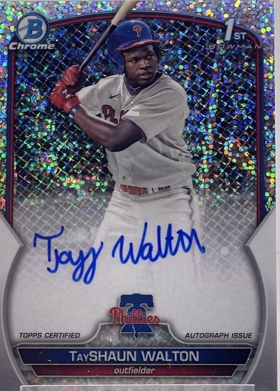 The TayShaun Walton 2023 Bowman Draft #CDA-TWA Chrome Prospect Auto - Sparkle Refractor /71 (1st) card in Raw condition has not changed in price in the last 30 days and was last sold for $122.50 .