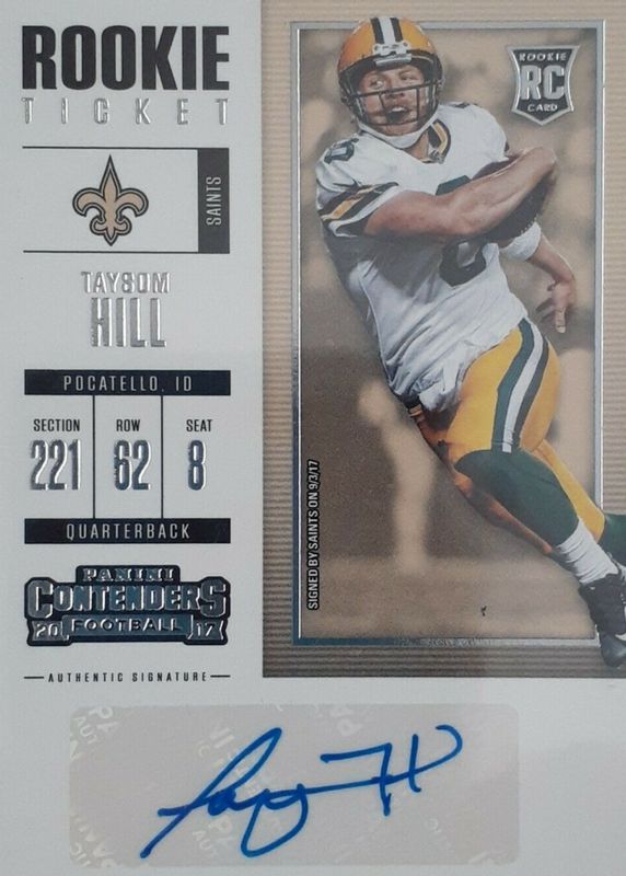 Taysom Hill's Football cards are available in at least 11 sets. Taysom Hill's biggest 7-day price movers are 2017 Contenders #249 Rookie Ticket Auto, 2017 Contenders #249 Rookie Ticket Auto - Championship Ticket (/49), and 2019 Panini Instant #121 Base.