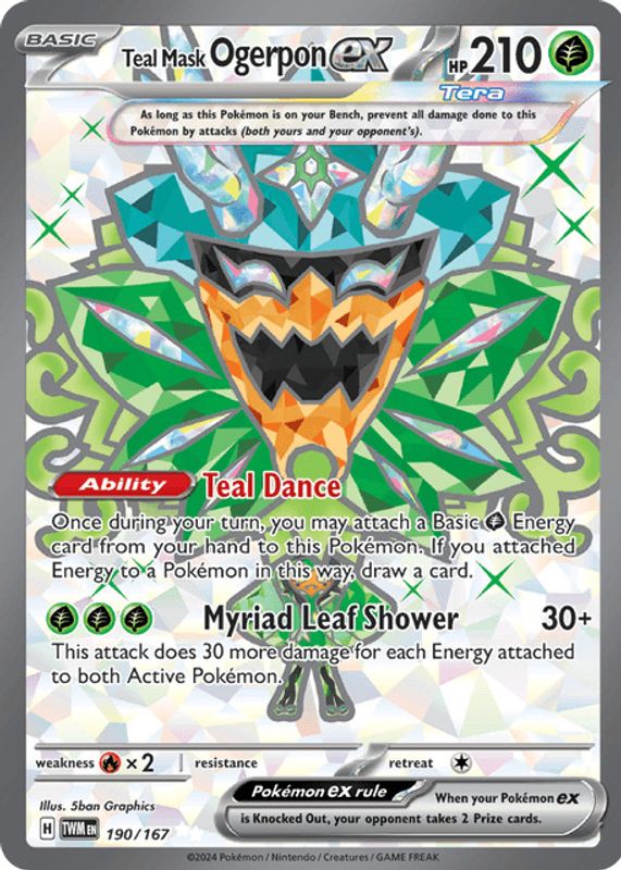 The Teal Mask Ogerpon ex 2024 Scarlet & Violet: Twilight Masquerade #190/167 Ultra Rare card in Raw TCG (Near Mint) condition has moved down -$0.04 (-1.0%) in the last 30 days and was last sold for $3.95 .