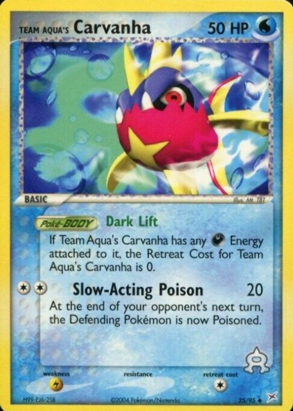 The Team Aqua's Carvanha 2004 EX: Team Magma vs Team Aqua #25/95 Base card in Raw TCG (Near Mint) condition has moved down -$4.22 (-68.0%) in the last 30 days and was last sold for $1.99 .
