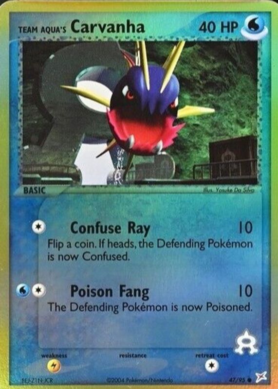 The Team Aqua's Carvanha 2004 EX: Team Magma vs Team Aqua #47/95 Reverse Holo card in Raw TCG (Near Mint) condition has not changed in price in the last 30 days and was last sold for $6.33 .