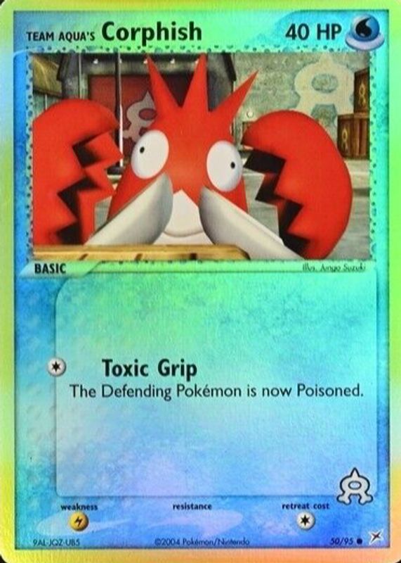 The Team Aqua's Corphish 2004 EX: Team Magma vs Team Aqua #50/95 Reverse Holo card in Raw TCG (Near Mint) condition has not changed in price in the last 30 days and was last sold for $10.00 .
